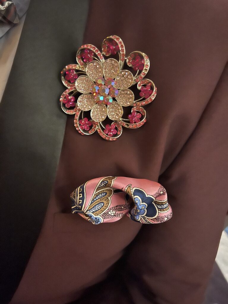 Businessman Tim Lowe wears them for a pop of fun in his otherwise classic attire. Keith White, a florist who oversaw the Pasadena Rose Ball for decades, repurposed a floral pin given to him by his beloved aunt. He wears it on his lapel. “It shouldn’t be only the girls who get the jewelry,” he said, noting that the pins connect him to loved ones, whether a mom, sister, friend, or aunt.
