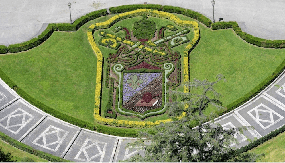 It consists of a mitre—recreated using Buxus sempervirens (dwarf boxwood)—placed between crossed gold and silver keys, bound with a red cord. The gold key was made using Euonymus aureus (variegated spindle), a plant that is regularly trimmed to remain dwarf and maintain its yellowish color. The silver key was created using Helichrysum italicum, a seasonal plant that must be replaced at least once a year to preserve its color.