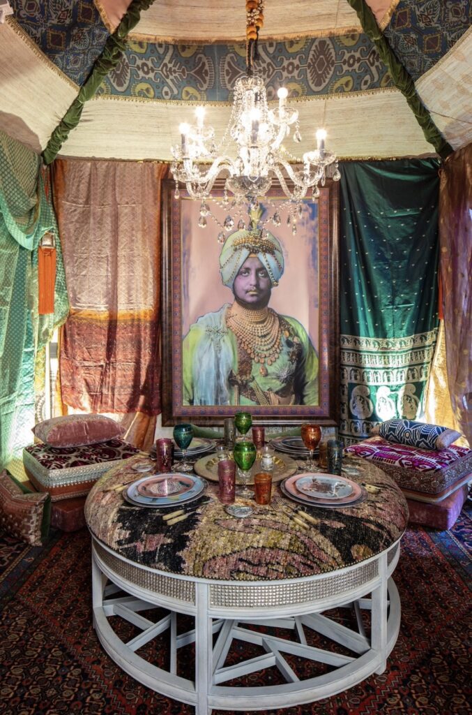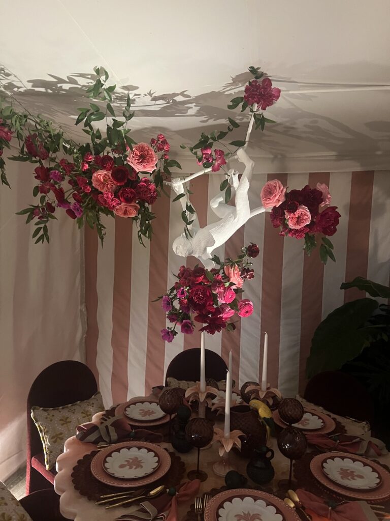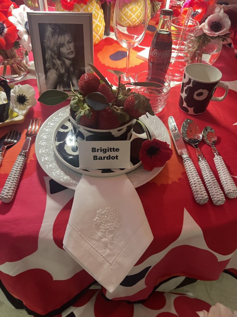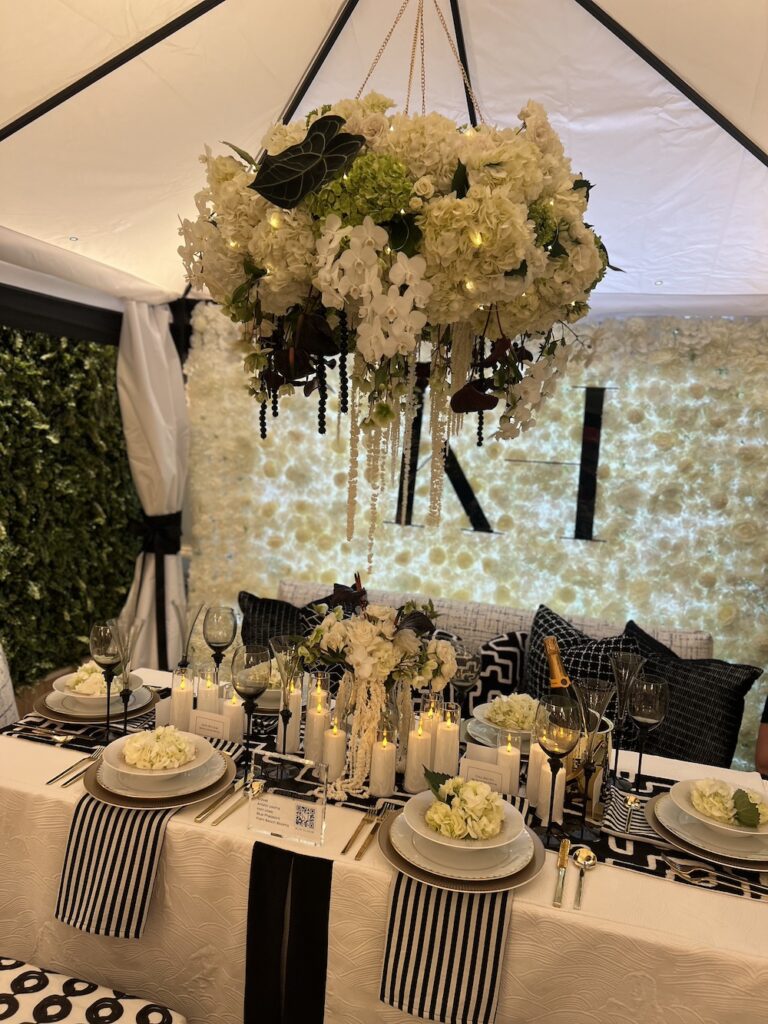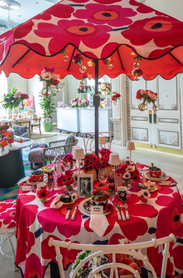 2) Andrea Stark’s table was an ode to “Flower Power” modernism with big bold flower prints on the tablecloth, canopy and chairs. Florist Tom Mathieu expertly used clusters of anemones to accent the fun happy decor. It was a perfect example of how using one type of flower can produce such magnificent outcomes. Stark placed photos of her dream guests from the 1960s including Brigitte Bardot, Twiggy, Jane Birkin, and Mary Quant at her red, white, and black poppy bedecked table. Furthermore, it was on trend with hanging overhead flowers in an interesting arrangement. Anemones in little bud vases tied by twine from the canopy was clever and whimsical. The table just oozed happy and fun which is how we want to feel when entertaining friends and family.
