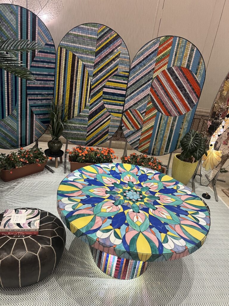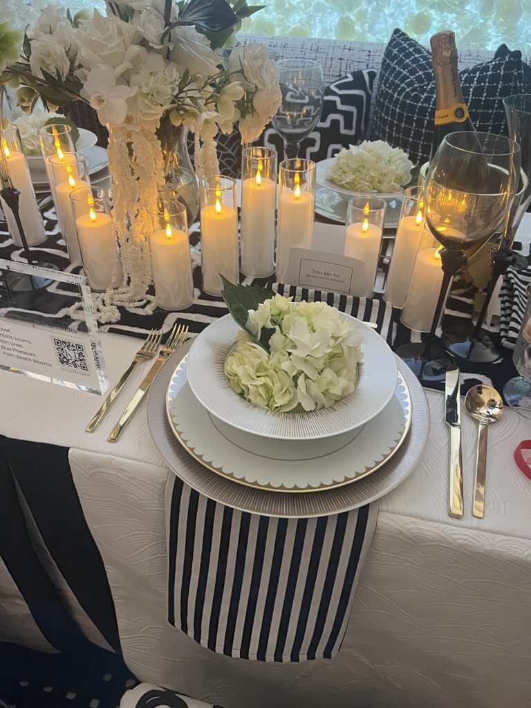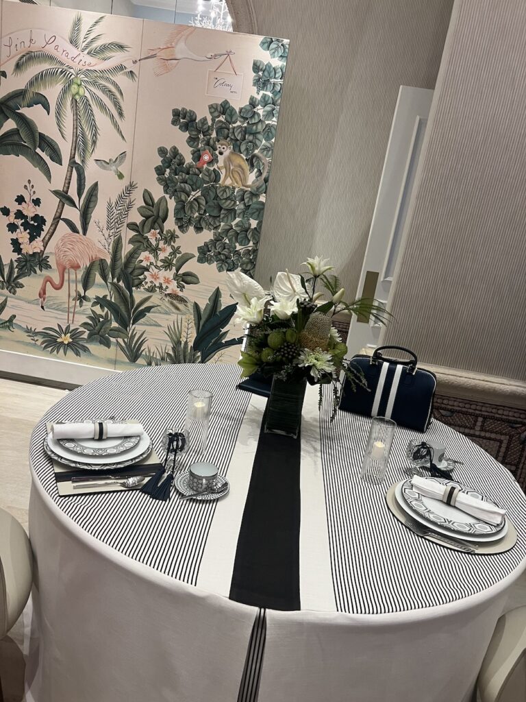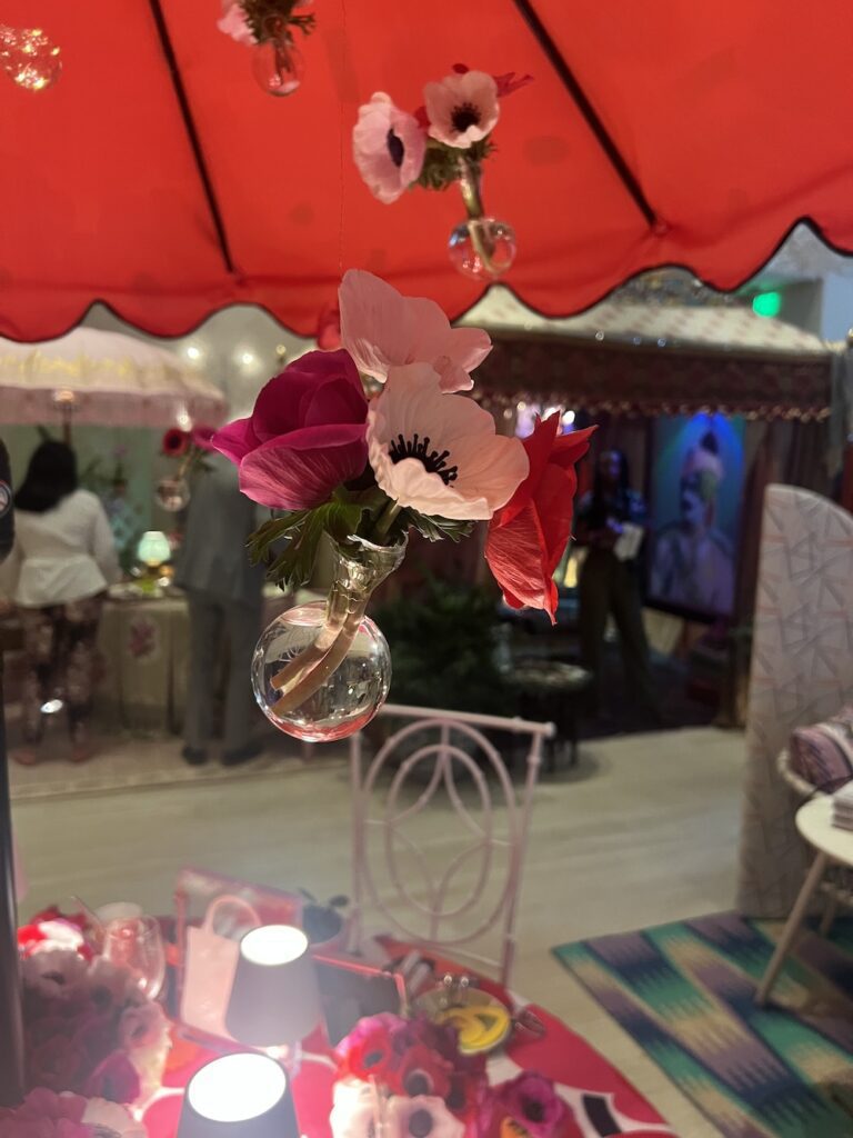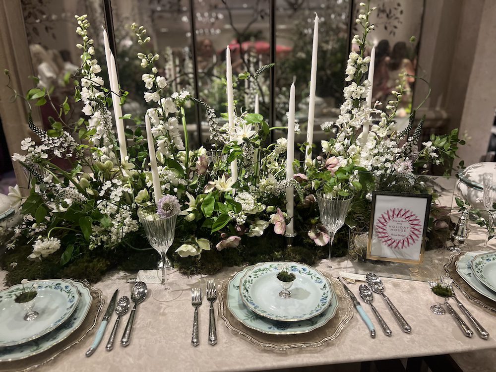 Lewis Miller created yet another showstopper for Lugano. Notice how Miller used tall vases along with shorter ones so you could have a dramatic impact without guests not being able to see each other. Among the flowers he used was a new Juliet spray rose from David Austin. The rose company spent $3 million to develop this classic rose which continues to be immensely popular across the globe. Miller also included new varieties of hellebore with dramatic plump interiors in shades of burgundy that matched the ultra suede mauve tablecloths. The pink glasses and candlesticks were pitch perfect as were using colorful candles to complement the lovely array of flowers. Using Bernardaud plates, he also tucked napkins under the dinnerware. Plus Lugano, a big sponsor of the Holiday House event, added little gift boxes. As Eddie Murphy once wisely said, “Everyone loves opening up presents.” And of course, since it is his signature flower, anemones were also plentiful.