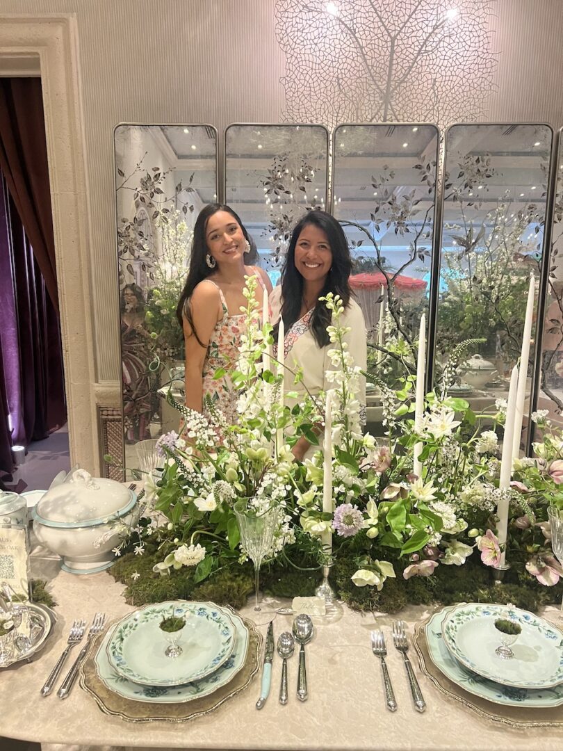 The team used Arhaus Furniture, Madeline Panel mirrors hand painted in Vietnam, Danae stone marble table, Rhodin dining chairs, Aquazurra plates, charming antique egg holder by Mappin & Web, soup tureens by Limoges, glasses by Vietri, flatware by Ricci Argentieri and place card holders by Ecruis.