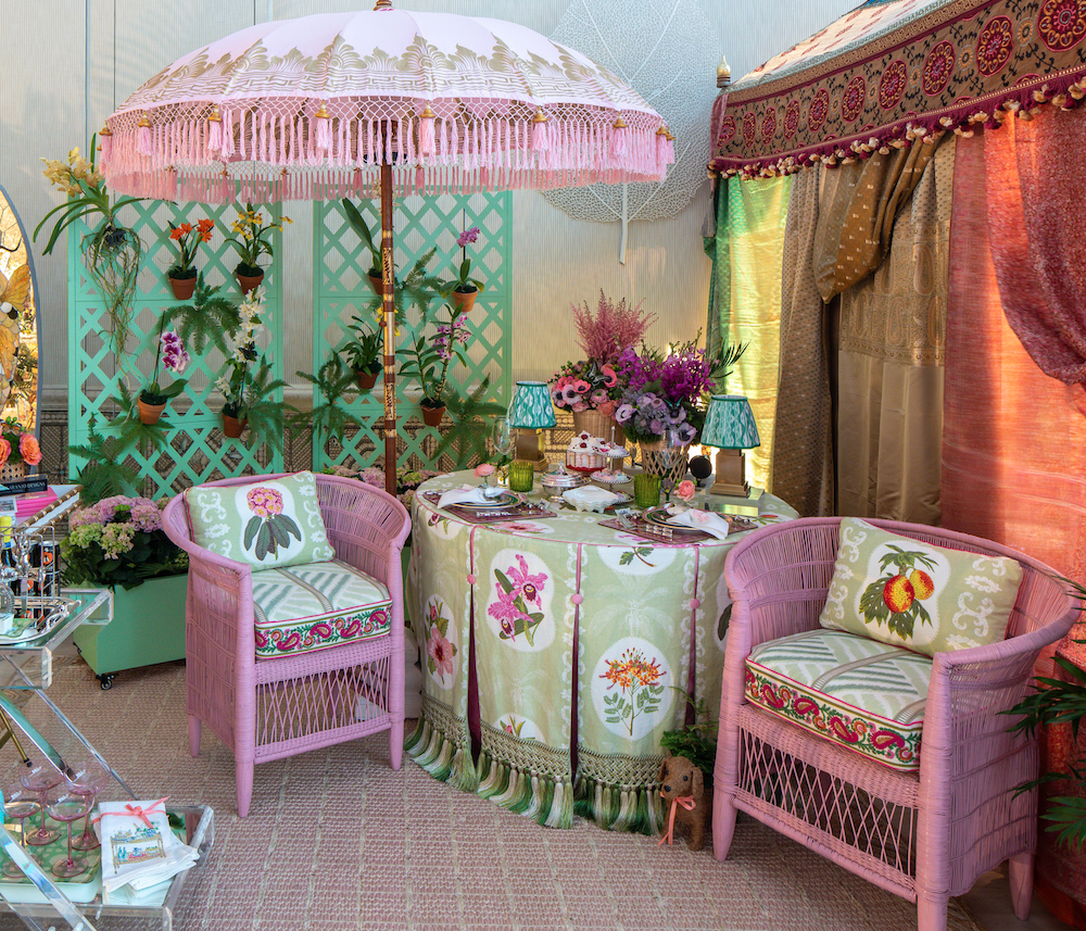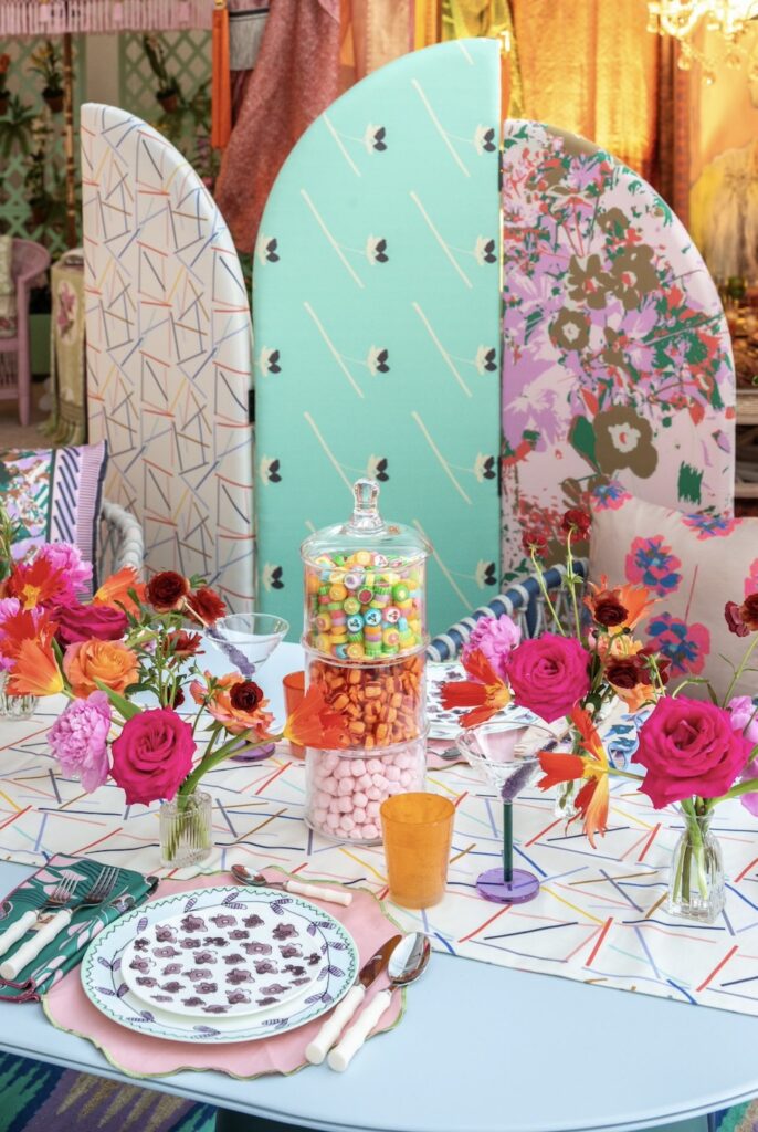 Alexandra Naranjo used this fab open fenced backdrop and filled it with pots of flowers and then added hydrangeas on the floor in painted wooden boxes to match the decor. Just felt so much like a garden and such a great idea. Fabrics were also so happy. Why not bring this idea indoors? Or outdoors.