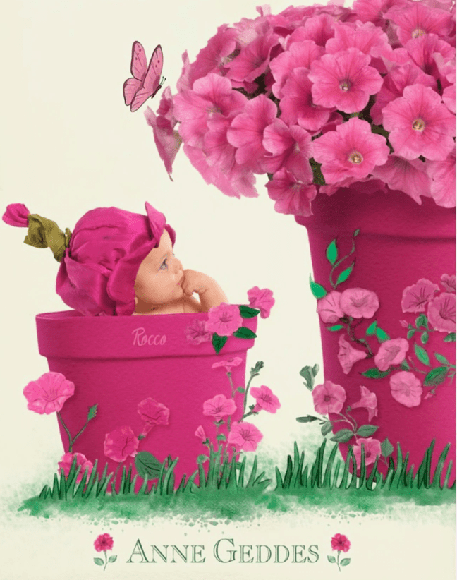 As part of the partnership, Geddes has crafted a series of images featuring 13 infants wearing petunia-themed hats, each nestled in the brand’s iconic pink pots in a natural setting. This collaboration highlights the enduring charm of Wave Petunias but also symbolizes themes of growth, renewal, and the nurturing aspects of gardening.